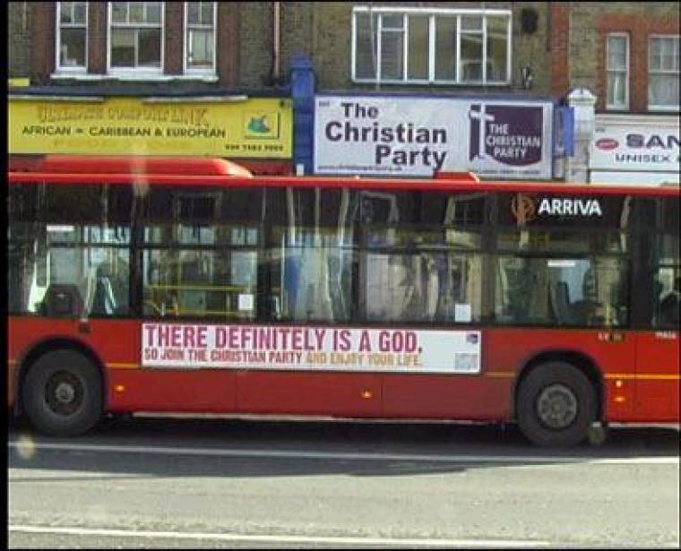 The Christian Party's ads are displayed on 50 London buses and carry the slogan: "There definitely is a God. So join the Christian Party and enjoy your life."