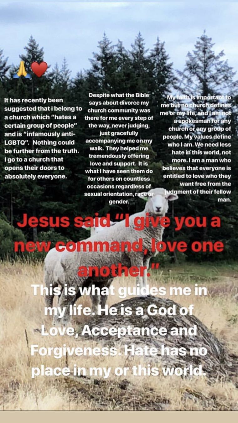 "It has recently been suggested that I belong to a church which 'hates a certain group of people' and is 'infamously anti-LGBTQ.' Nothing could be further from the truth," he wrote. "I go to a church that opens their doors to absolutely everyone. Despite what the Bible says about divorce, my church community was there for me every stop [sic] of the way, never judging, just gracefully accompanying me on my walk. They helped me tremendously offering love and support. It is what I have seen them do for others on countless occasions regardless of sexual orientation, race or gender."