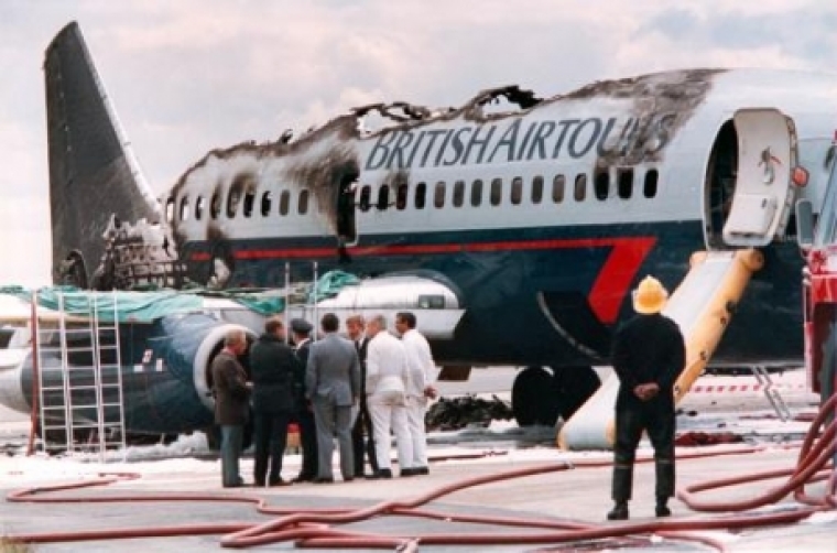 Fifty-five people died when fire engulfed a British Airtours plane on the runway of Manchester as it was taking off.