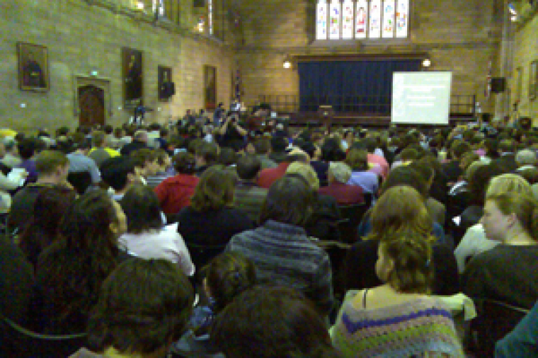 The hall was packed with people streaming in where for some the destruction of the church was still overwhelming.