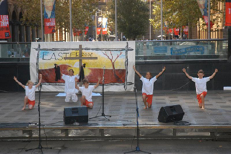 At the opening event in Sydney's Martin Place, pupils from the St George Christian School, Hurstville, the Bethel Christian School, Mt Druitt and the Kindalin Christian School, Castlereagh, presented the Easter Story in music and drama. For many it was their first public appearance and the success was evident from the appreciation and applause given by the onlookers.