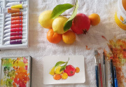 At an old fruit orchard, I sat in the afternoon sun in a quiet, sunlit room. I laid out a still-life arrangement, the "fruits of the harvest" – ripe lemons, pomegranates, mandarins... plucked from trees I had walked amongst, chosen for their colour, their aroma, their flavour.