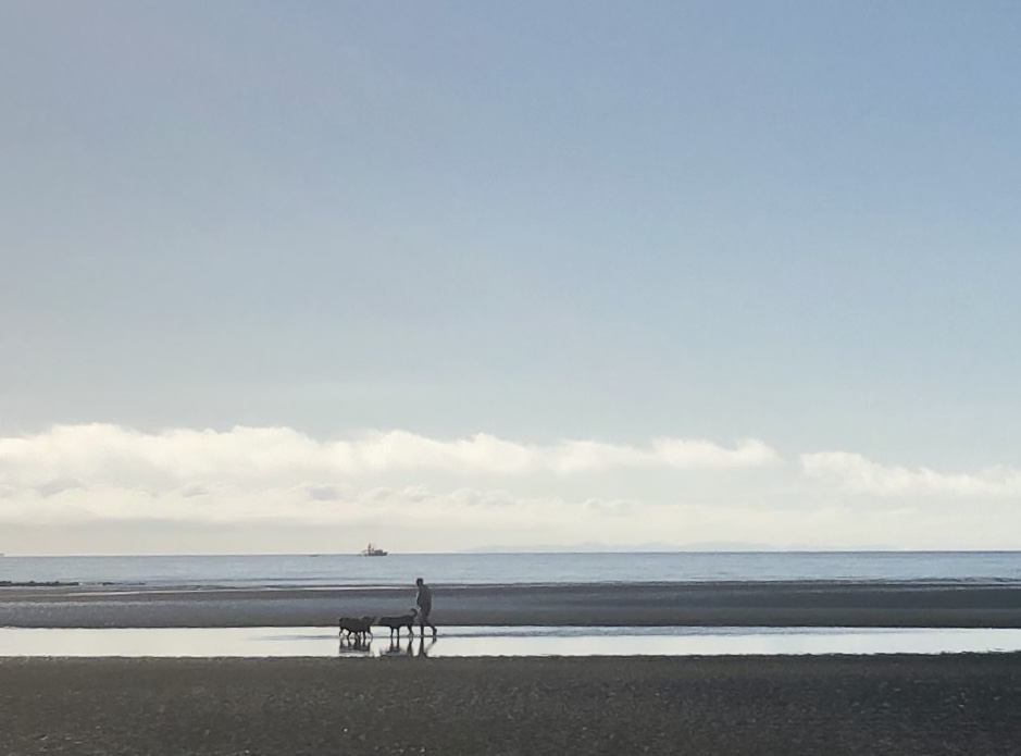 Photo - Midge Point Beach with fishing boat and man walking his dogs