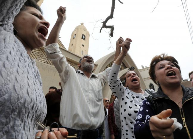 Relatives of victims react in front of a Coptic church that was bombed earlier this year Egypt. (Reuters)