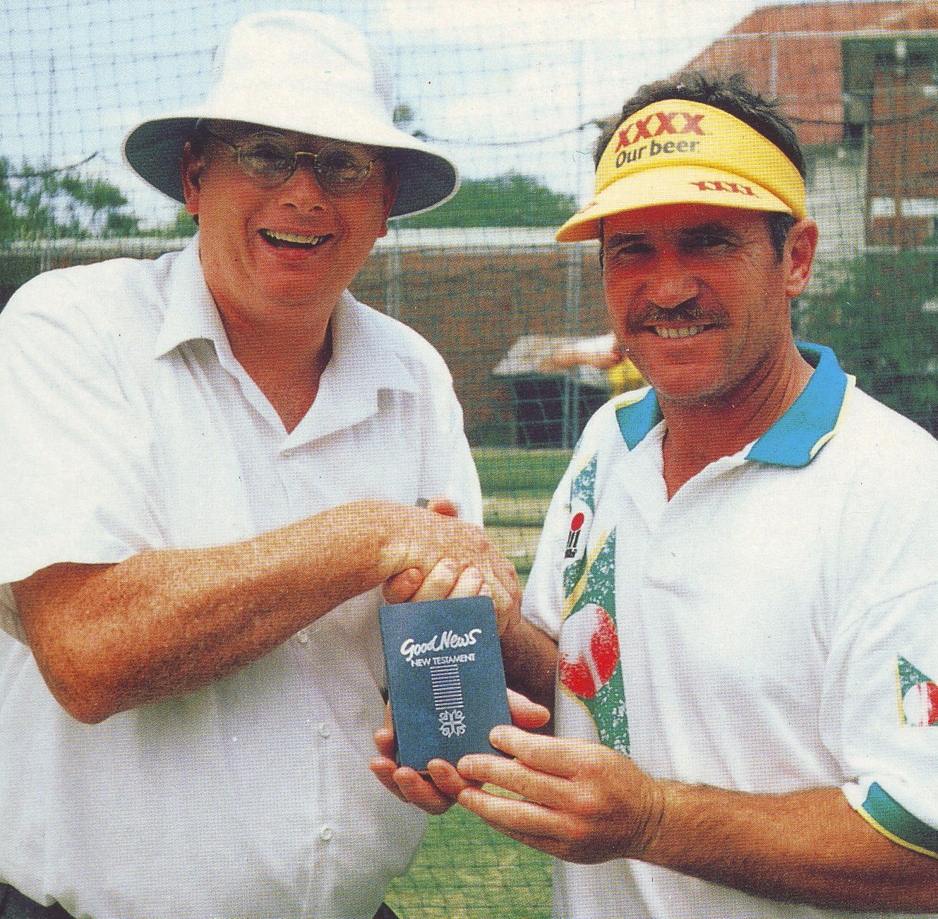 Photo - 1994 Australian cricket captain Allan Border celebrating Mark Tronson's 10th year as team chaplain with a Bible Society bible given to each cricketer.