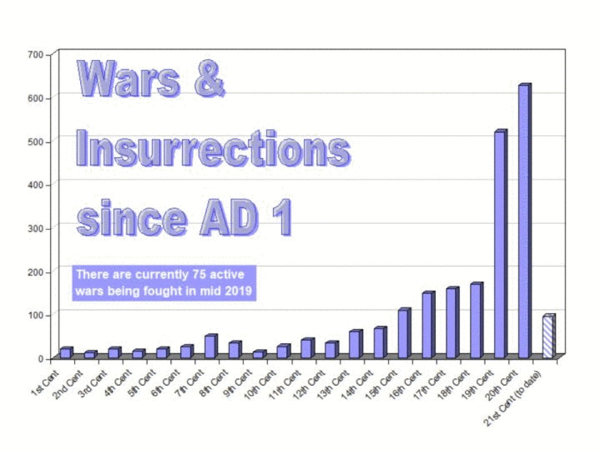 The United Nations was formed for the purpose of preventing war. They do a whole lot of other things today, but that was their original mission. Yet at the time of writing, seventy-five active wars are being fought across the world today. Seventy-five!