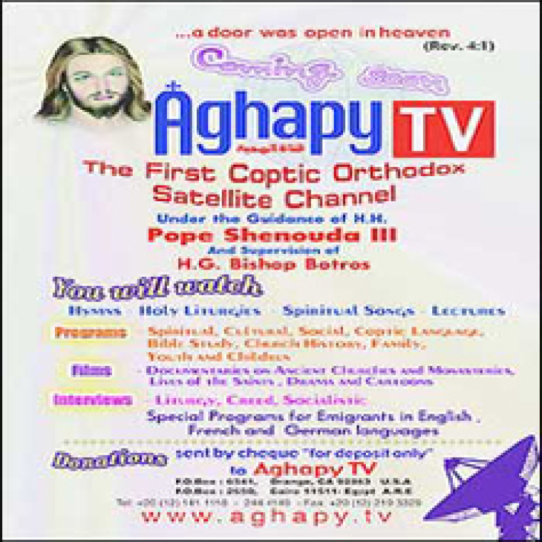 "The channel is under the guidance of Pope Shenuda III himself, who appointed a general committee of 13 bishops," Aghapy TV executive director Father Bishoy Al Antony told AFP. Pope Shenuda III is the head of Egypt's Coptic Orthodox Church, the 117th Pope of Alexandria and Patriarch of the See of St. Mark.