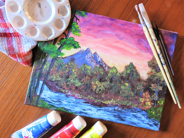 After painting the background sky, the tutorial took us through creating a few mountain peaks. This was one of the most satisfying things to paint. The mountain looked beautiful, floating in the middle of the blended sky colours with its shadows and highlights, but the painting was not yet done. I would have been happy stopping at this point; that mountain and sky seemed like a finished picture to me. However, if I had stopped then, I would have missed out of the forest, the leaves, the bushes, the stream, the fuller and even more beautiful scene that lay ahead.