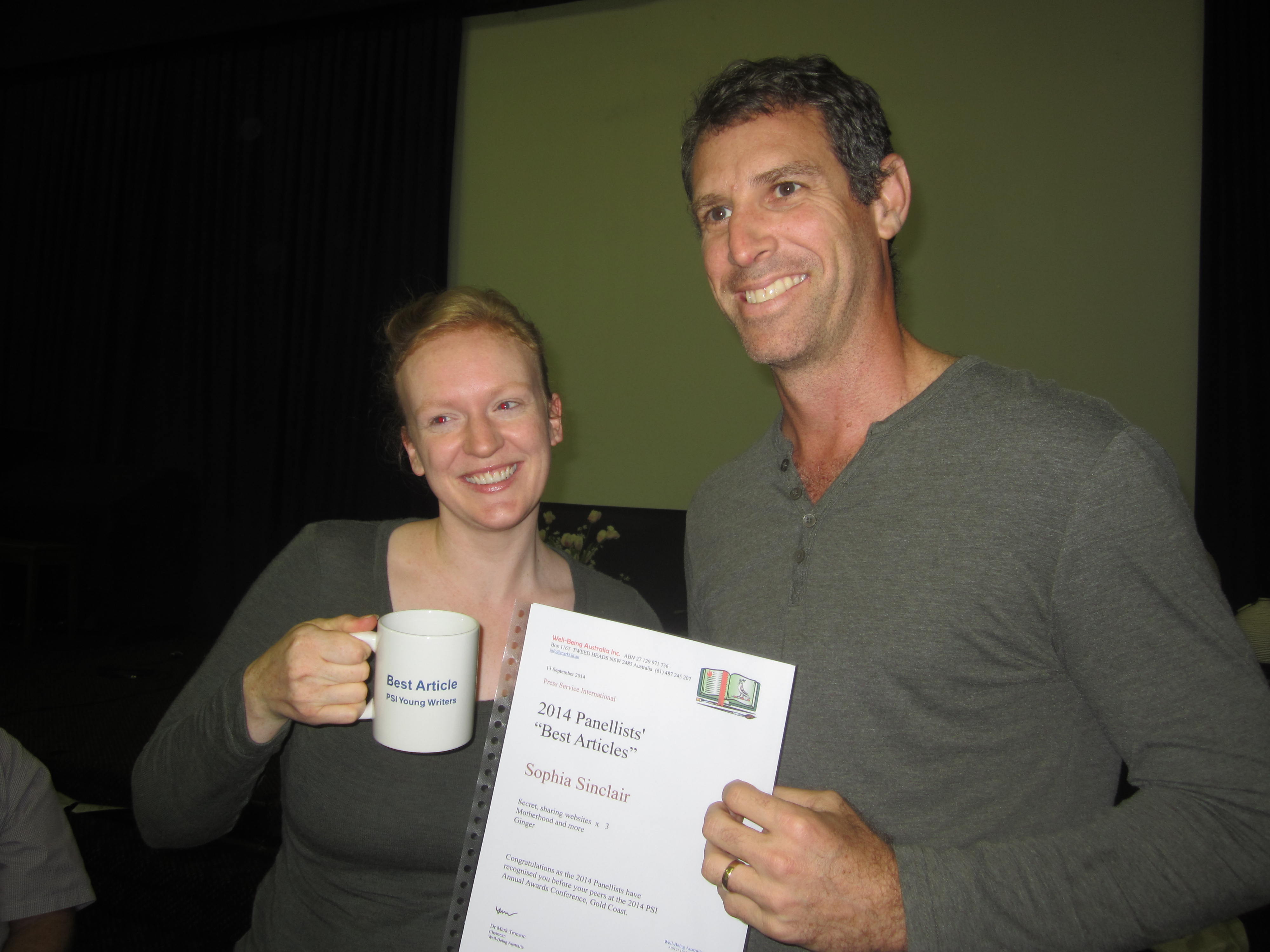 Photo - 2014 Tweed Heads Awards – NZ’s Sophia Sinclair (Christchurch) presented by Russell Modlin (young writers rep on Well-Being Australia)