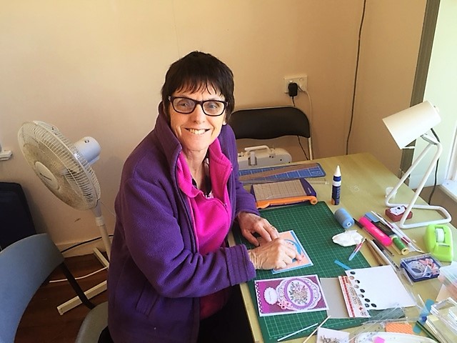Delma Tronson's hand crafted cards at her card desk visiting Laguna Quays Respite