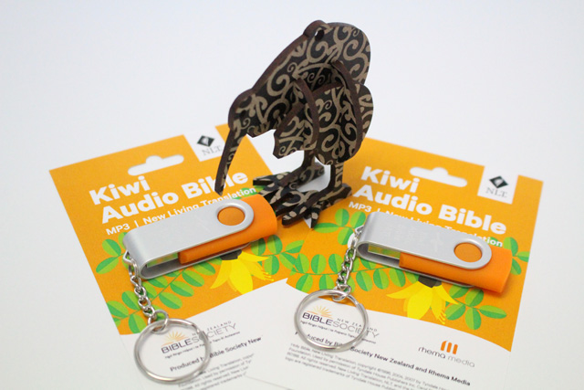 The Kiwi Audio Bible (New Living Translation) comes on a USB stick and is available at Bible Society New Zealand and Manna for the special introductory price of $14.99. For more details or to order go to www.biblesociety.org.nz or visit manna.co.nz