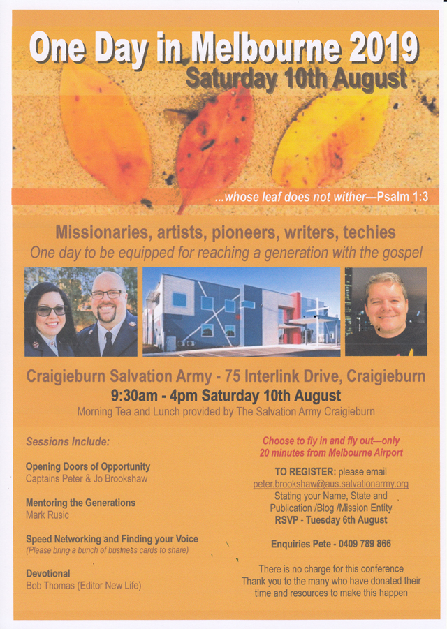 The 4th ‘One Day in Melbourne’ for missions’ communications personnel this year under fresh leadership will be held at Craigieburn Salvation Army on Saturday 10 August.
