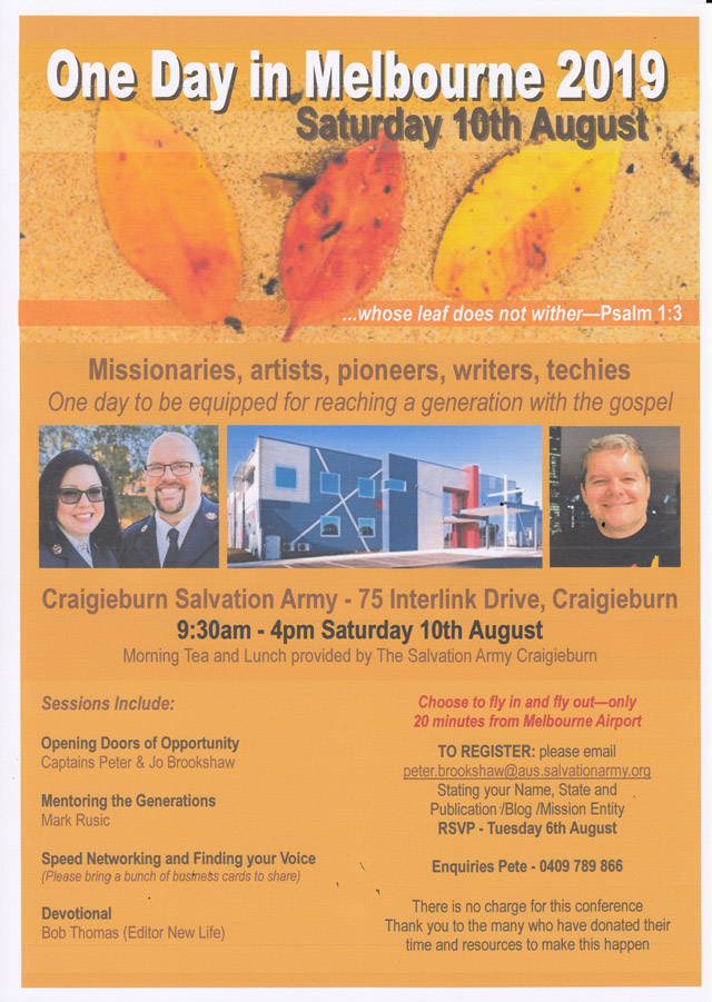 The 4th ‘One Day in Melbourne’ for missions’ communications people this year under fresh leadership will be held at Craigieburn Salvation Army on Saturday 10 August. It is a day of massive punch.