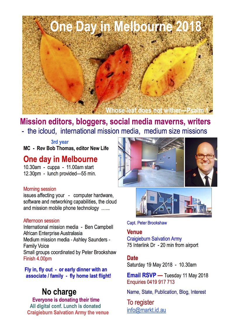 This is the 3rd annual One Day in Melbourne for mission publication editors, writers, designers, social media mavens, authors, bloggers, self-publishers ….