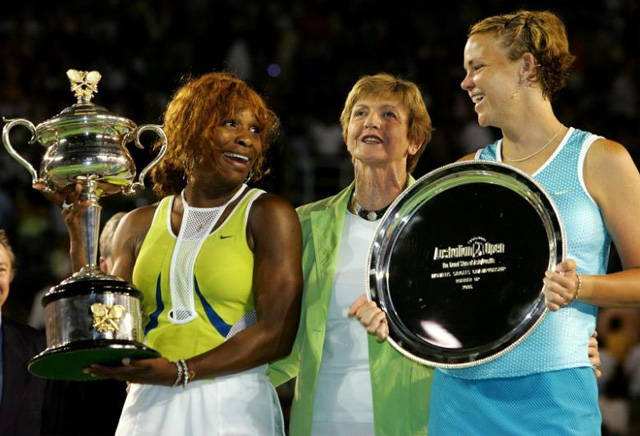 after the trophy presentation at the 2005 Australian Open tennis tournament in Melbourne. (Reuters)