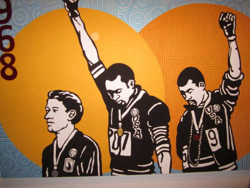 It depicts Tommy Smith the 1968 Mexico Olympic Champion in the 200 metre sprint along with Bronze winner John Carlos having been presented their medals, placed on black gloves and during the USA’s Anthem recital, raised their arms above their heads.