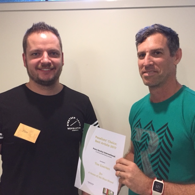Tim Everton (Adelaide) the 2016 – last year – Basil Sellers winner being presented his 2017 Best Article