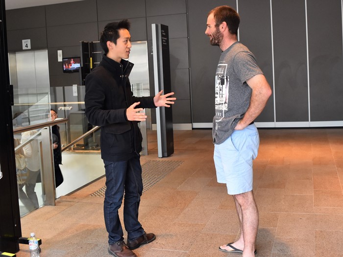 Councillor Brendon Zhu speaking with a Chatswood Library user about public internet and community services. Photo: Roydon Ng